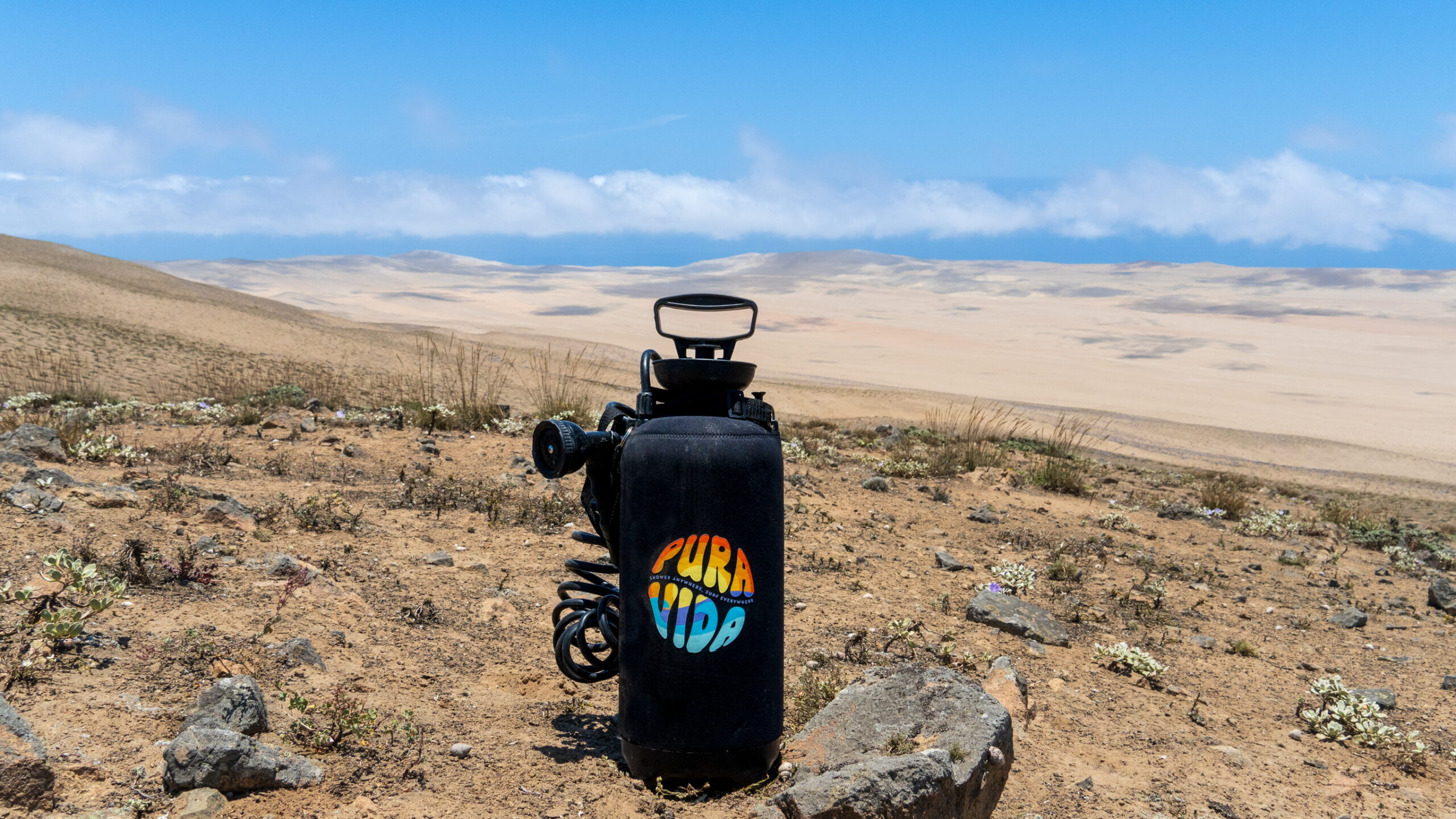 Ducha portátil Pura Vida de 8 litros para surf, camping, deportes de aventura, viajes largos y outdoor life. Sistema práctico, funcional y fácil de usar. Capacidad de 8 litros, alta presión de agua con 10 modos de spray, y cobertor de neopreno que protege y mantiene la temperatura del agua.